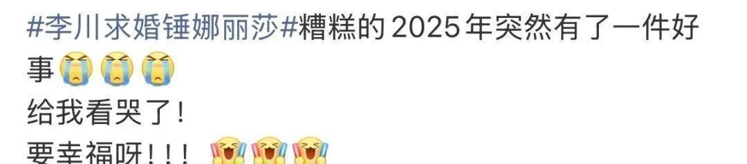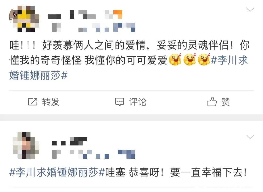 词条#李川求婚锤娜丽莎#迅速“爆了”网友们纷纷送上祝福: